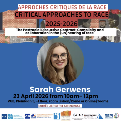 | The Postracial Discursive Contract: Complicity and collaboration in the (un)hearing of race CAR Seminar Series | Guest speaker: Sarah Gerwens, Brussels School of Governance (BSoG) | |