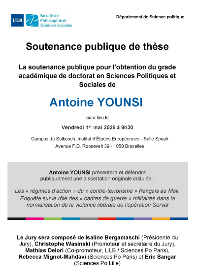| Soutenance publique de thèse de Antoine Younsi Antoine Younsi présentera et défendra publiquement une dissertation originale intitulée : Les « régimes d’action » du « contre-terrorisme » français au Mali. Enquête sur le rôle des « cadres de guerre » militaires dans la normalisation de la violence libérale de l’opération Serval. | |