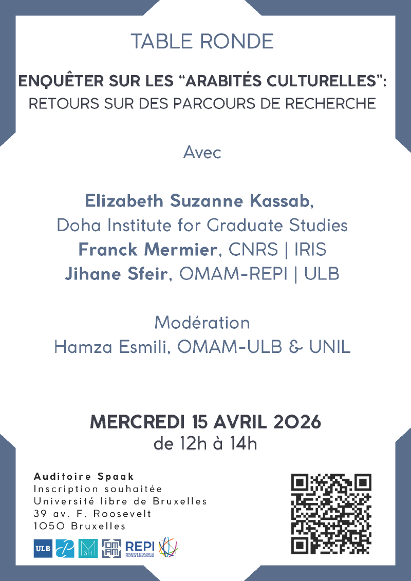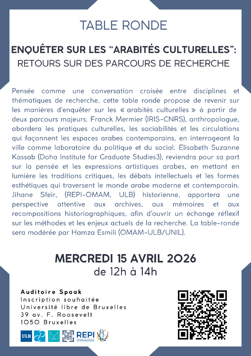 Pensée comme une conversation croisée entre disciplines et thématiques de recherche, cette table ronde propose de revenir sur les manières d'enquêter sur les « arabités culturelles » à partir de deux parcours majeurs. Franck Mermier (IRIS-CNRS), anthropologue, abordera les pratiques culturelles, les sociabilités et les circulations qui façonnent les espaces arabes contemporains, en interrogeant la ville comme laboratoire du politique et du social. Elisabeth Suzanne Kassab (Doha Institute for Graduate Studies3), reviendra pour sa part sur la pensée et les expressions artistiques arabes, en mettant en lumière les traditions critiques, les débats intellectuels et les formes esthétiques qui traversent le monde arabe moderne et contemporain. Jihane Sfeir, (REPI-OMAM, ULB) historienne, apportera une perspective attentive aux archives, aux mémoires et aux recompositions historiographiques, afin d'ouvrir un échange réflexif sur les méthodes et les enjeux actuels de la recherche. La table-ronde sera modérée par Hamza Esmili (OMAM-ULB/UNIL).
